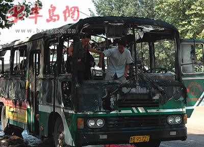 记者闻讯赶到事发现场时看到,110民警已经将该路段进行了封锁,大火已基本被消防队员扑灭,而起火的公交车已成了“空架子”。一名目击者告诉记者,事发时他看到公交车被熊熊大火包围着,俨然成了辆“火车”。现场浓烟滚滚,在风的吹动下,火势越来越旺,并不断发出“噼里啪啦”的响声。火苗“舔”着路边的行道树。刚从车上逃下来的乘客虽都站在了安全地带,但仍惊恐不已。