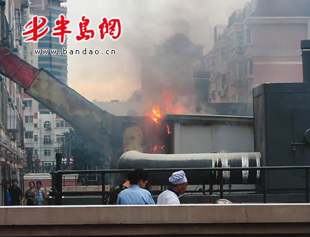 9月5日下午 4时许,记者闻讯赶到现场。此时,火势已基本被控制住。消防队员正在用水枪向院内三层平台上的大型排油烟设备喷水。