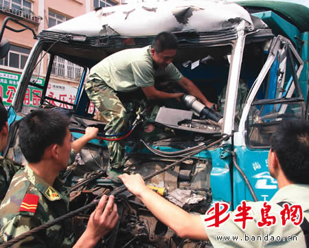 现场的一位民警告诉记者,他们接到报警后迅速赶到了现场,指挥前面的货车用钢丝绳把后面货车挤瘪的车头拉开一点缝隙。10时20分许,错埠岭消防中队的消防官兵赶到现场,撬动凹陷的车头。30多分钟后,消防官兵找到了切割的最佳位置,用液压扩张钳,把压在司机身上的方向盘切割断,把受伤的司机从里面抬了出来,送往海慈医院抢救。