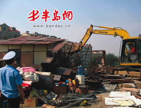 12日上午10时,市南城管行政执法局的执法人员赶到了这个垃圾村,率先对外围的由该村村民私自占地修建的两处修车厂和两处废品收购站进行了强制拆除,并对村内的住户下达了责令限期搬离的通知。
