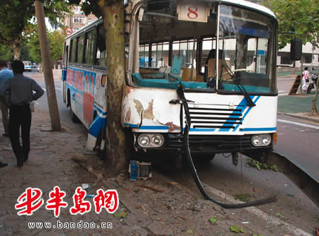 9月13日下午4时30分许,在商河路与包头路路口,一辆从包头路驶来的客车拐弯时,由于车速太快撞上一辆在商河路上行驶的8路公交车,被撞公交车当即失去平衡撞上了路边的大树,事故共造成5名乘客受伤。